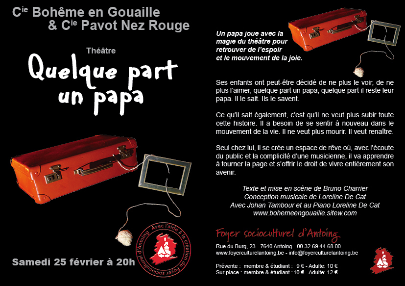Le Foyer Socioculturel d'Antoing a accueilli "quelque part un papa" avec Johan Tambour et Loreline Decat, un spectacle écrit par Bruno Charrier, mise en scène collective; avec Olivier Deleplanque à l'éclairage.